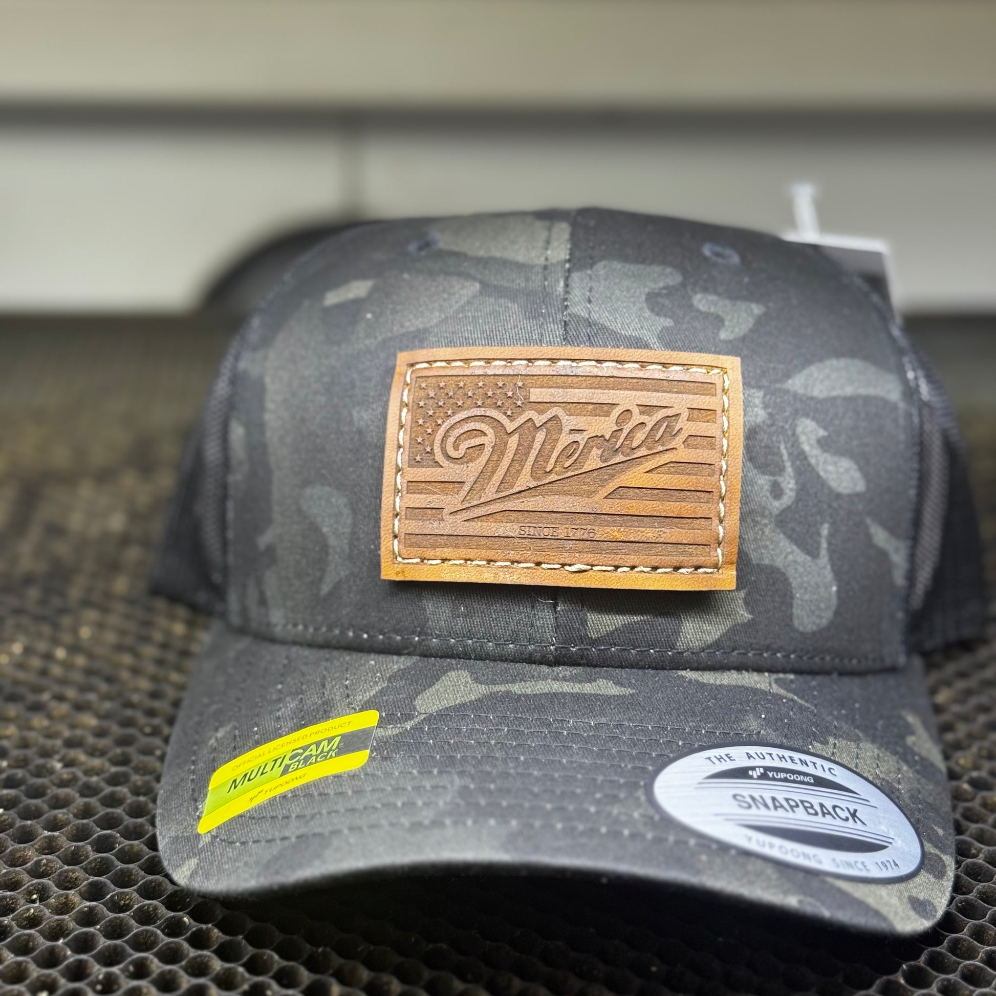Merica brown leather patch stitched to a BMC hat.
